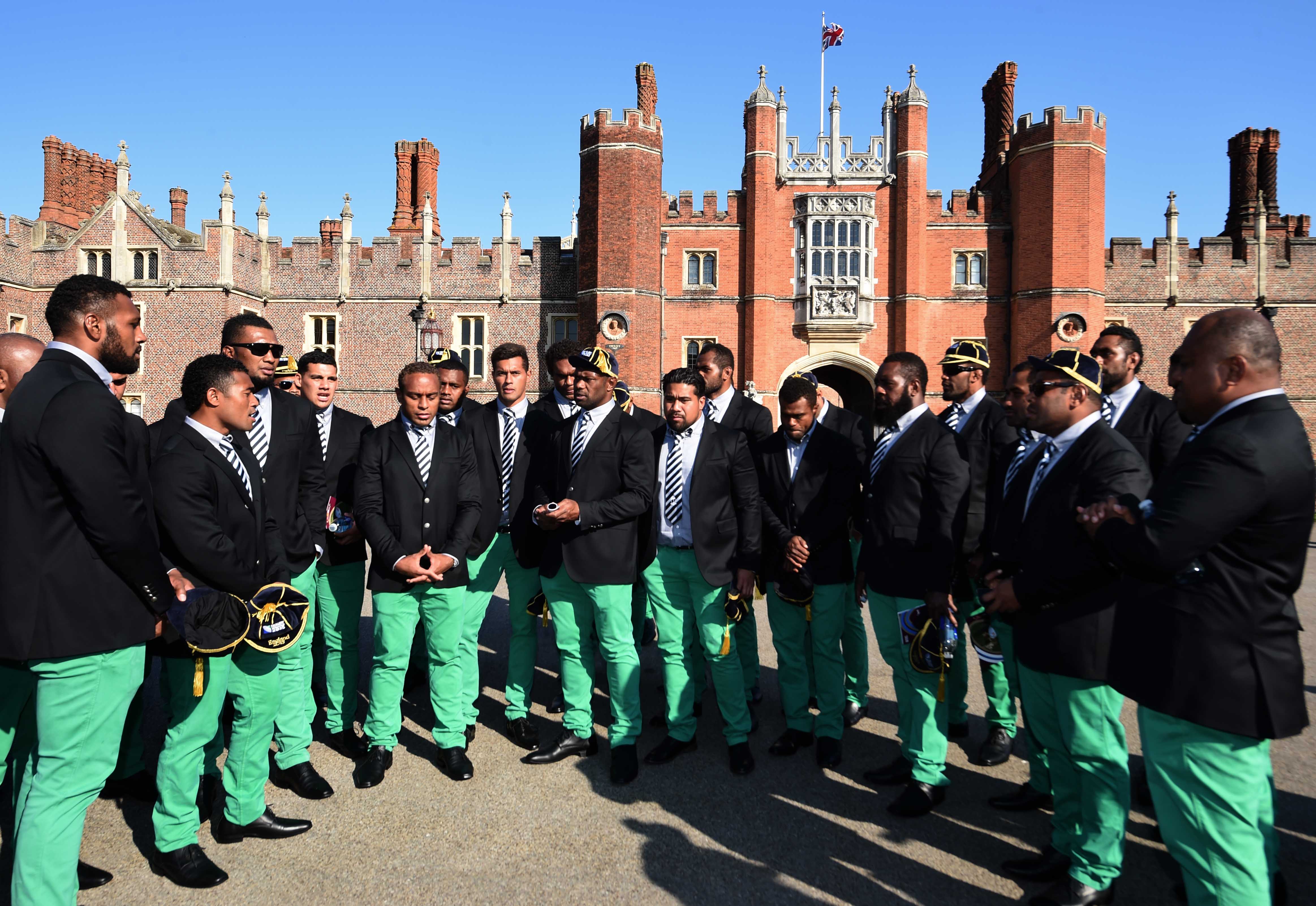 LONDON, ENGLAND – SEPTEMBER 10: Members of the the Fiji 2015 World Cup Rugby Union squad sing outside Hampton Court Palace following thier official welcoming Ceremony on September 10, 2015 in London, England. (Photo by Stuart C. Wilson/Getty Images for ER2015)