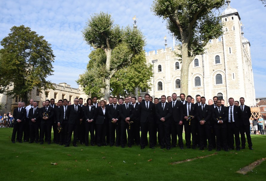 LONDON, ENGLAND – SEPTEMBER 11: The New Zealand All Blacks team poses for photographs following their Rugby World Cup 2015 Welcome Ceremony at The Tower of London on September 11, 2015 in London, England. (Photo by Stuart C. Wilson/Getty Images for ER2015)
