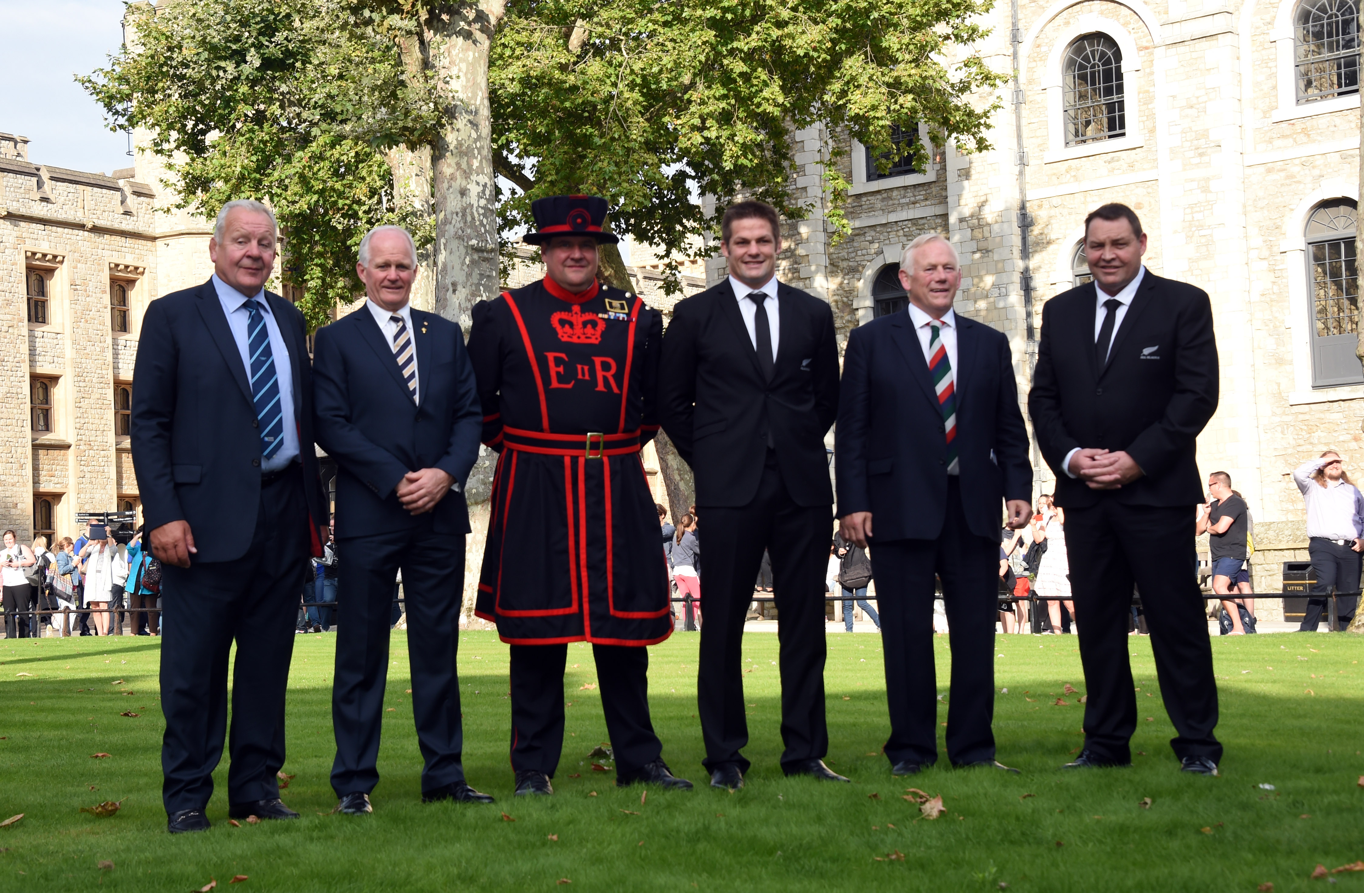 LONDON, ENGLAND – SEPTEMBER 11: Rugby dignitaries including Bill Beaumont, Richie McCaw and Steve Hansen pose for photographs following the New Zealand All Blacks Rugby World Cup 2015 Welcome Ceremony at The Tower of London on September 11, 2015 in London, England. (Photo by Stuart C. Wilson/Getty Images for ER2015)