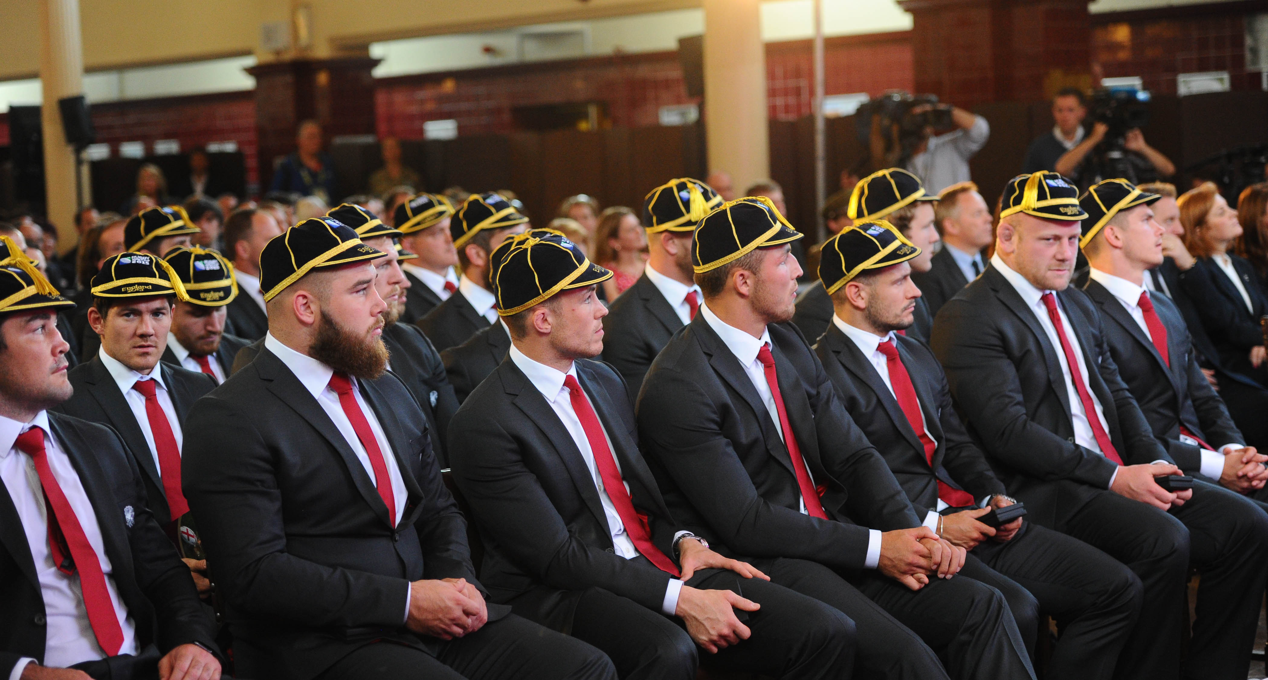 CAMBERLEY, ENGLAND – SEPTEMBER 12: The England Rugby World Cup Team listen to speeches during their Rugby World Cup Welcome Ceremony at Royal Military Academy Sandhurst on September 12, 2015 in Camberley, England. (Photo by Stuart C. Wilson/Getty Images for ER2015)