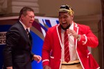 - CHELTENHAM, ENGLAND – SEPTEMBER 12: Trevita Mailau receives cap from Nigel Pickering during RWC 2015 Welcome Ceremony – Tonga at Cheltenham Town Hall on September 12, 2015 in Cheltenham, England. (Photo by Richard Stonehouse/Getty Images for ER2015)