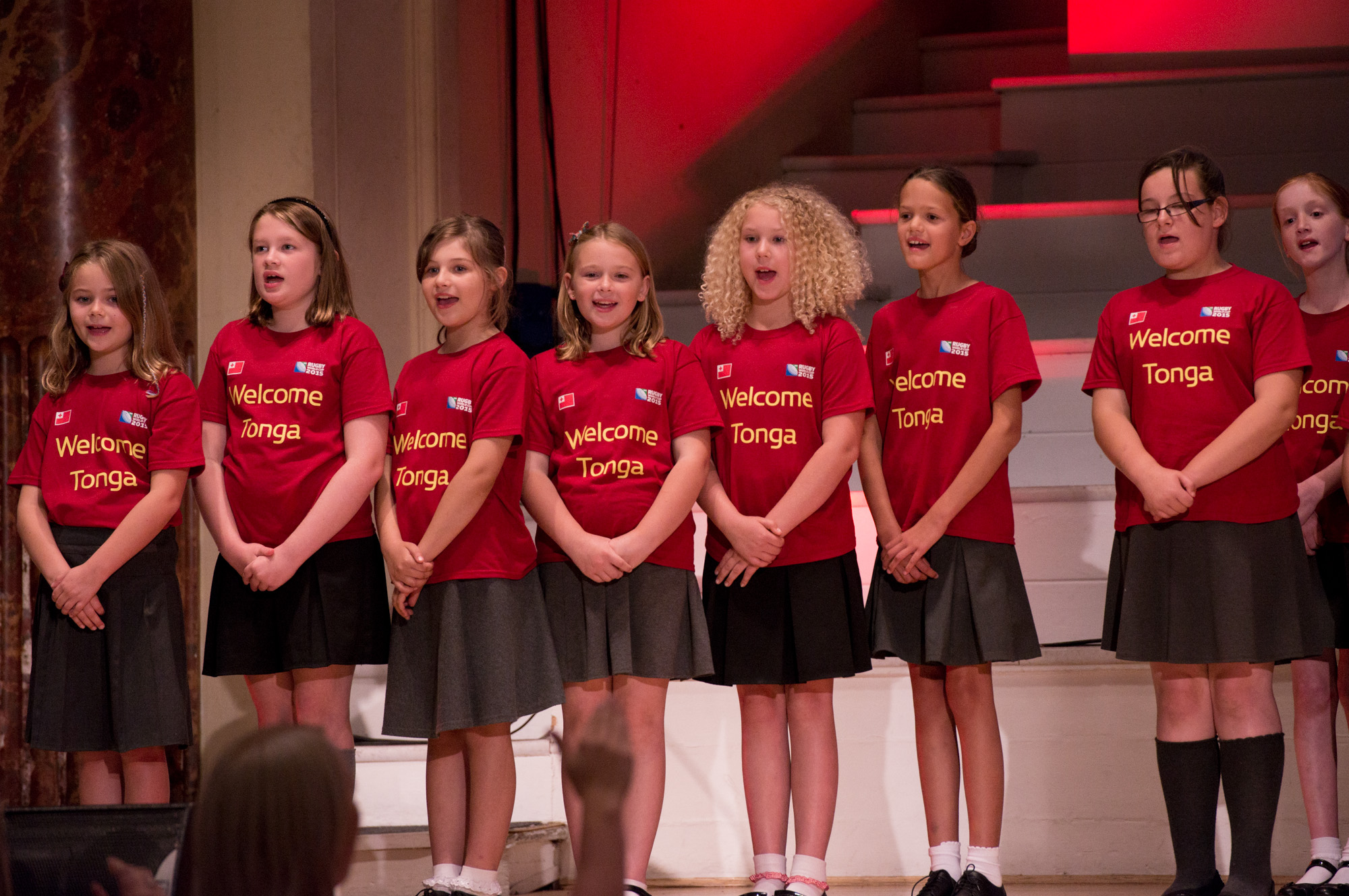 CHELTENHAM, ENGLAND – SEPTEMBER 12: Members of the Bishop’s Cleeve Primary Acadamy sing during the RWC 2015 Welcome Ceremony – Tonga at Cheltenham Town Hall on September 12, 2015 in Cheltenham, England. (Photo by Richard Stonehouse/Getty Images for ER2015)