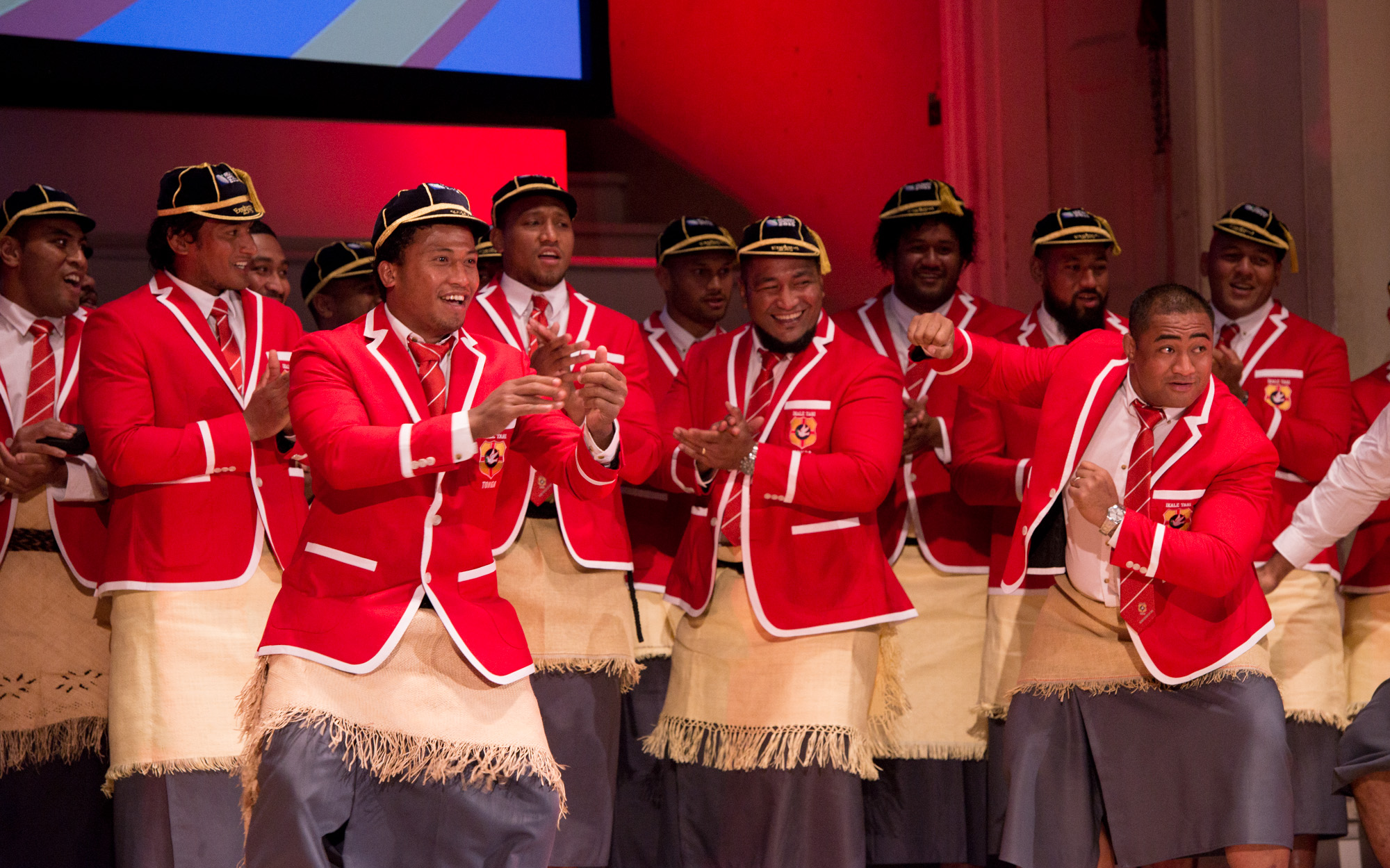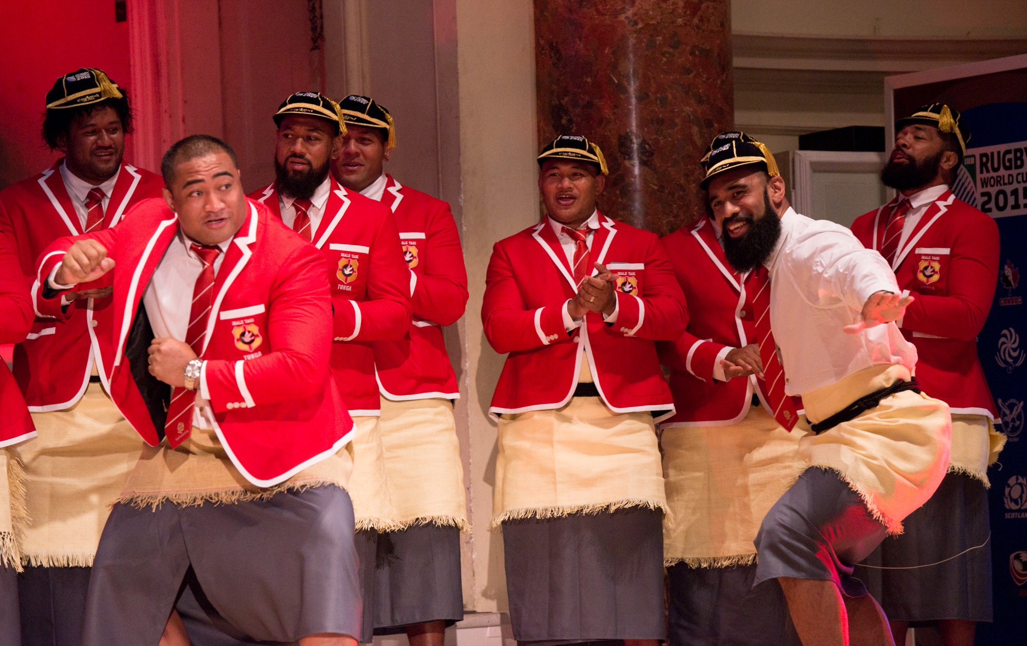 CHELTENHAM, ENGLAND – SEPTEMBER 12: Player dance and sing Sisu Koe Captain Hymn at RWC 2015 Welcome Ceremony – Tonga at Cheltenham Town Hall on September 12, 2015 in Cheltenham, England. (Photo by Richard Stonehouse/Getty Images for ER2015)