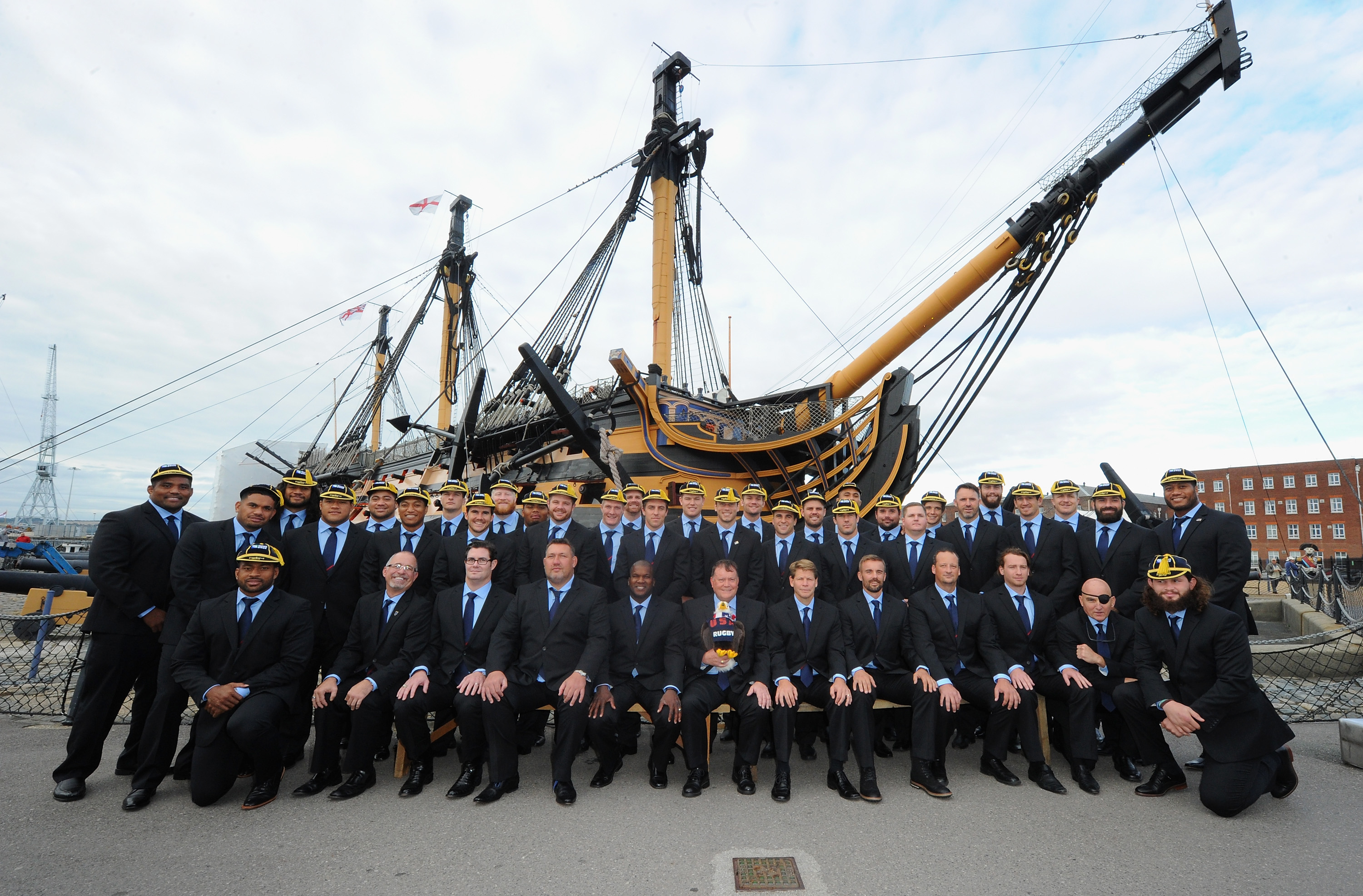 PORTSMOUTH, ENGLAND – SEPTEMBER 13: The USA Rugby Squad pose during the 2015 Rugby Wolrd Cup USA Welcome function at HMS Victory on September 13, 2015 in Portsmouth, England. (Photo by Eamonn M. McCormack/Getty Images for ER2015)