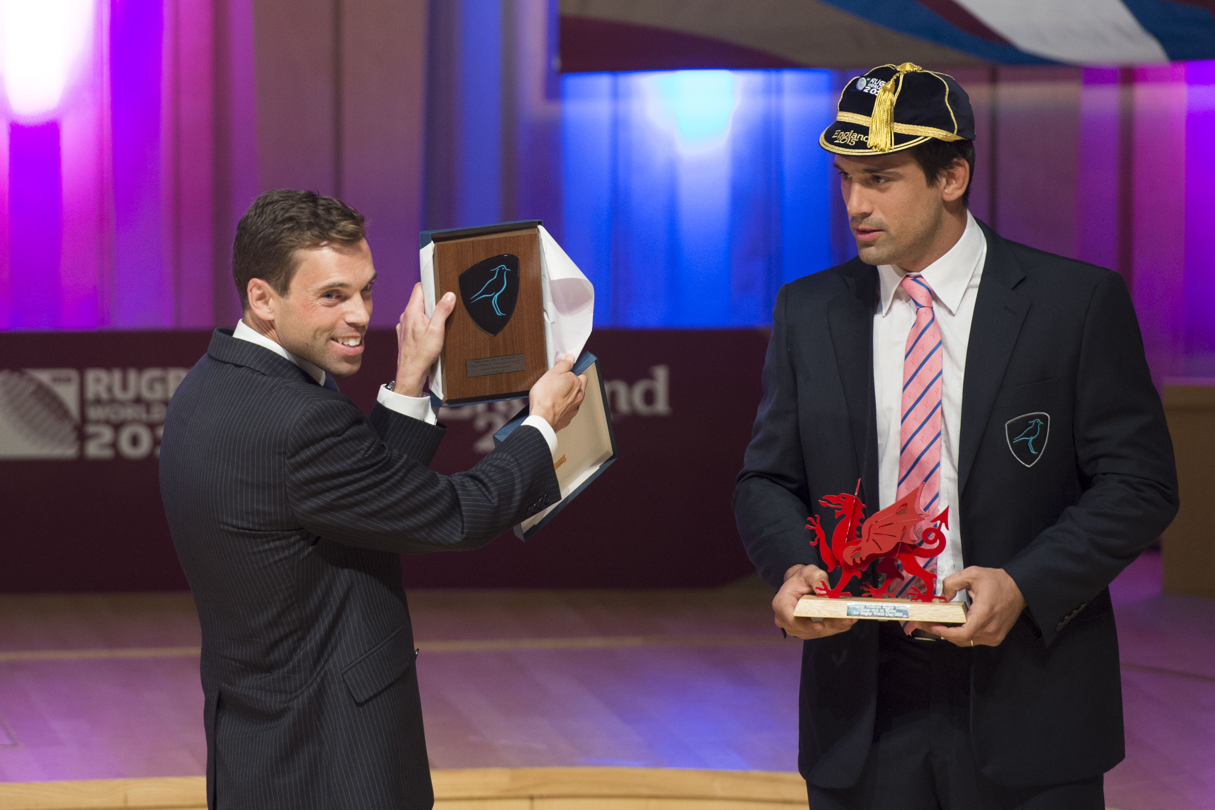 CARDIFF, WALES – SEPTEMBER 14: Deputy Minister for Culture, Sport and Tourism Ken Skates AM (L) receives a gift from Uruguay rugby captain Santiago Vilaseca at the Uruguay 2015 World Cup team welcoming ceremony at the Royal Welsh College of Music and Drama on September 14, 2015 in Cardiff, Wales.(Photo by Matthew Horwood/Getty Images for ER2015)
