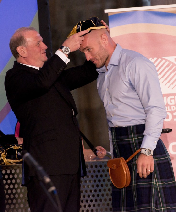 GLOUCESTER, ENGLAND – SEPTEMBER 17: Alasdair Strkosch receives his Rugby World Cup cap from Andy Cosslett at the RWC 2015 Welcome Ceremony – Scotland at Gloucester Cathedral on September 17, 2015 in Gloucester, England. (Photo by Richard Stonehouse/Getty Images for ER2015)