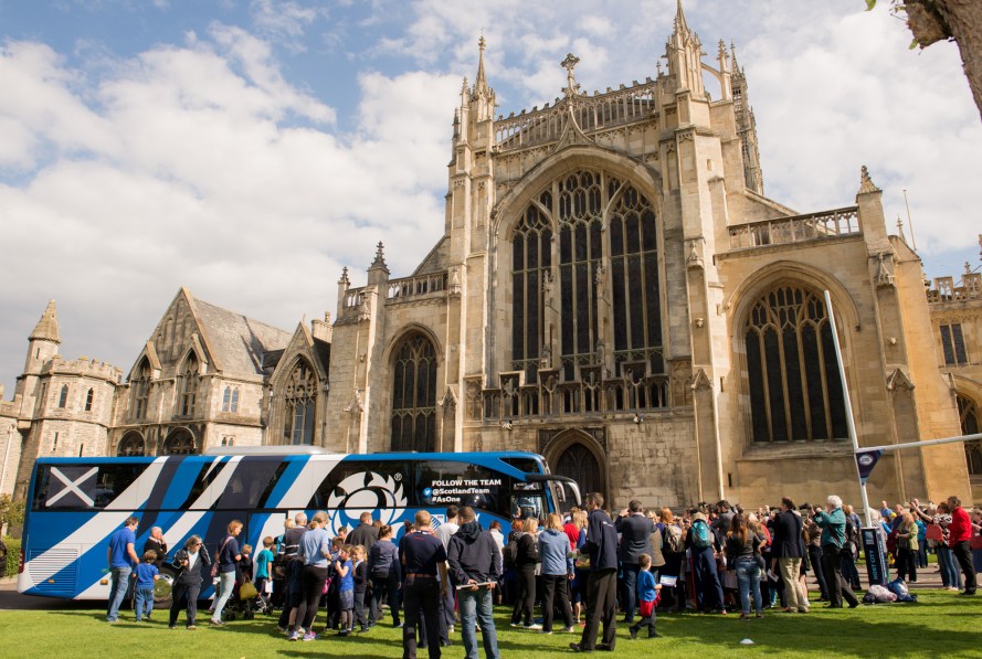 GLOUCESTER, ENGLAND – SEPTEMBER 17: Scotland team arrive and sign autographs for the waiting crowd before the RWC 2015 Welcome Ceremony – Scotland at Gloucester Cathedral on September 17, 2015 in Gloucester, England. (Photo by Richard Stonehouse/Getty Images for ER2015)