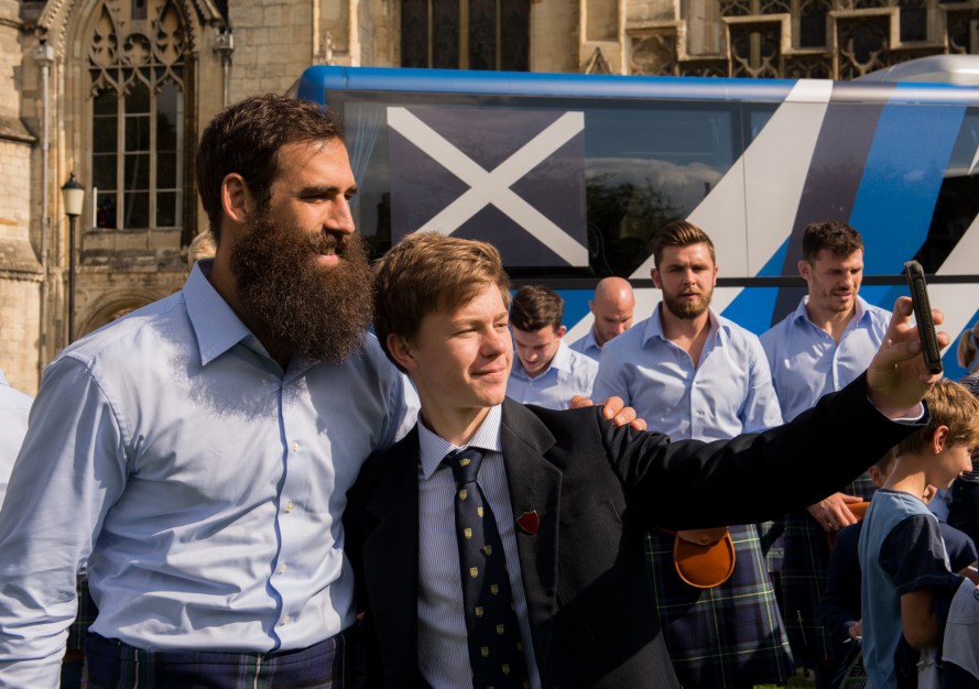 GLOUCESTER, ENGLAND – SEPTEMBER 17: Scotland player John Strauss poses for a selfie with a fan after arriving to attend RWC 2015 Welcome Ceremony – Scotland at Gloucester Cathedral on September 17, 2015 in Gloucester, England. (Photo by Richard Stonehouse/Getty Images for ER2015)