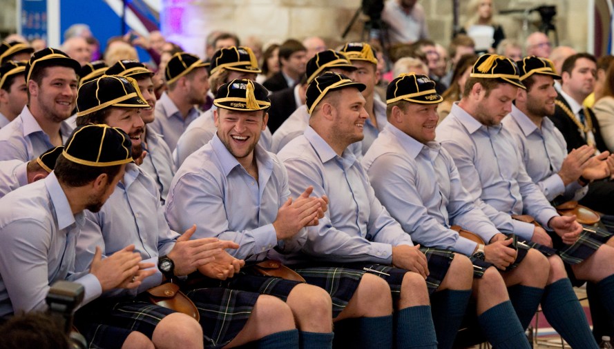 GLOUCESTER, ENGLAND – SEPTEMBER 17: Members of the Scotland team with their World Cup caps during the RWC 2015 Welcome Ceremony – Scotland at Gloucester Cathedral on September 17, 2015 in Gloucester, England. (Photo by Richard Stonehouse/Getty Images for ER2015)