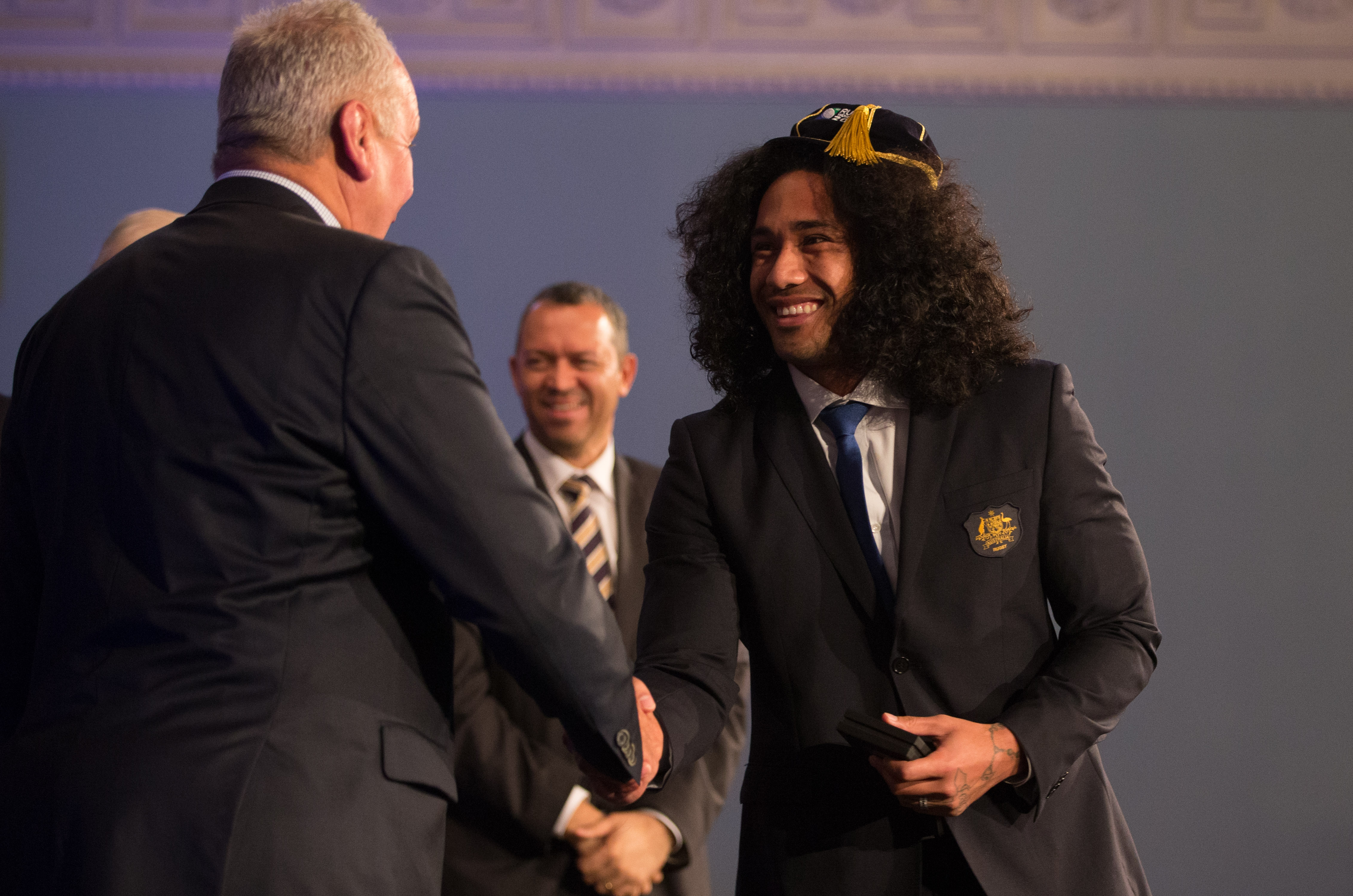 BATH, ENGLAND – SEPTEMBER 15: Joe Tomone (R) receives his Rugby World Cup cap and medal during the Rugby World Cup 2015 Australia Welcome Ceremony at The Bath Assembly Rooms on September 15, 2015 in Bath, England. (Photo by Matt Cardy/Getty Images for ER2015)