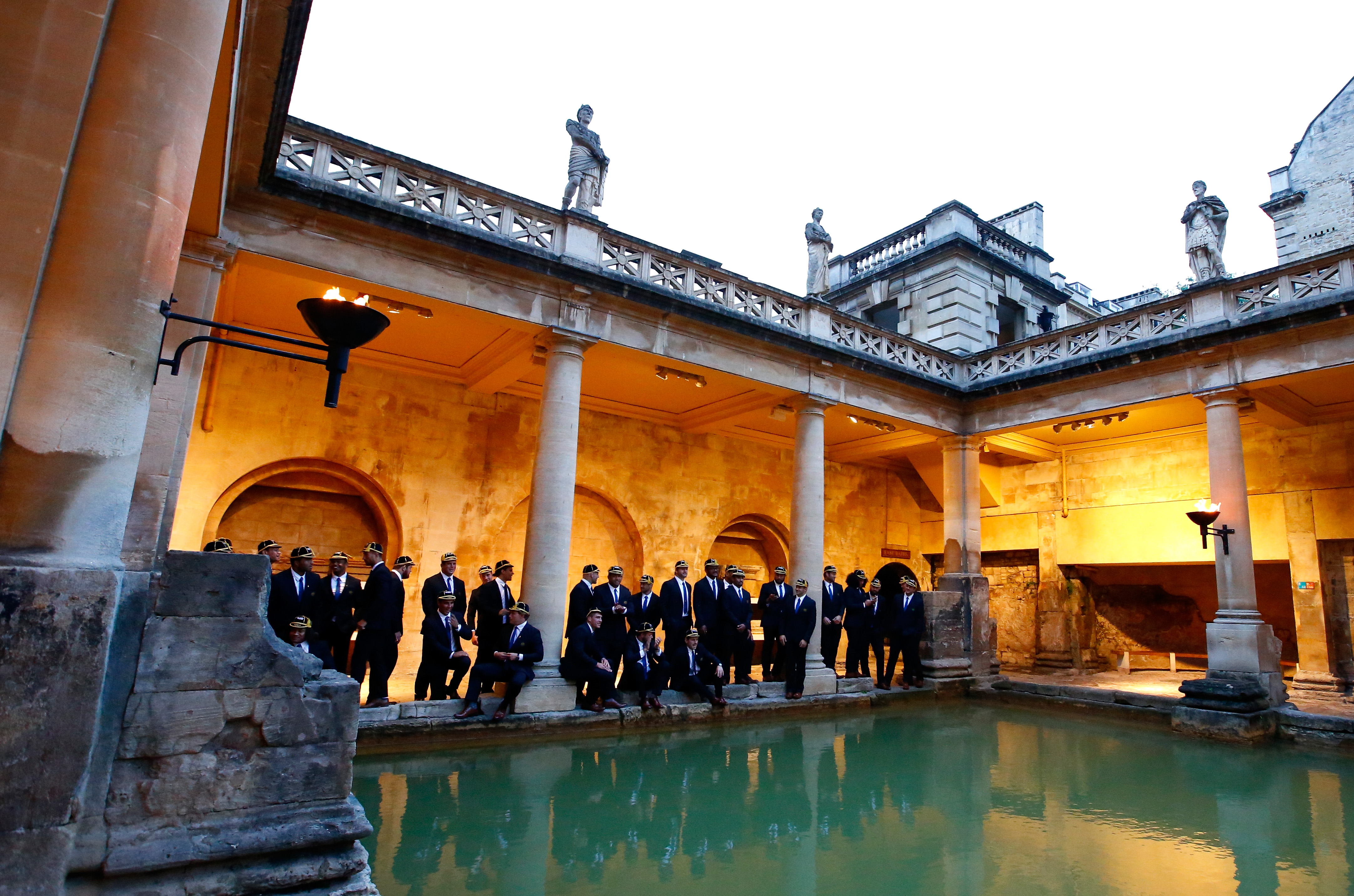 BATH, ENGLAND – SEPTEMBER 15: The Australia Team poses for a photograph during the Rugby World Cup 2015 Australia Welcome Ceremony at The Roman Baths on September 15, 2015 in Bath, England. (Photo by Dan Mullan/Getty Images)