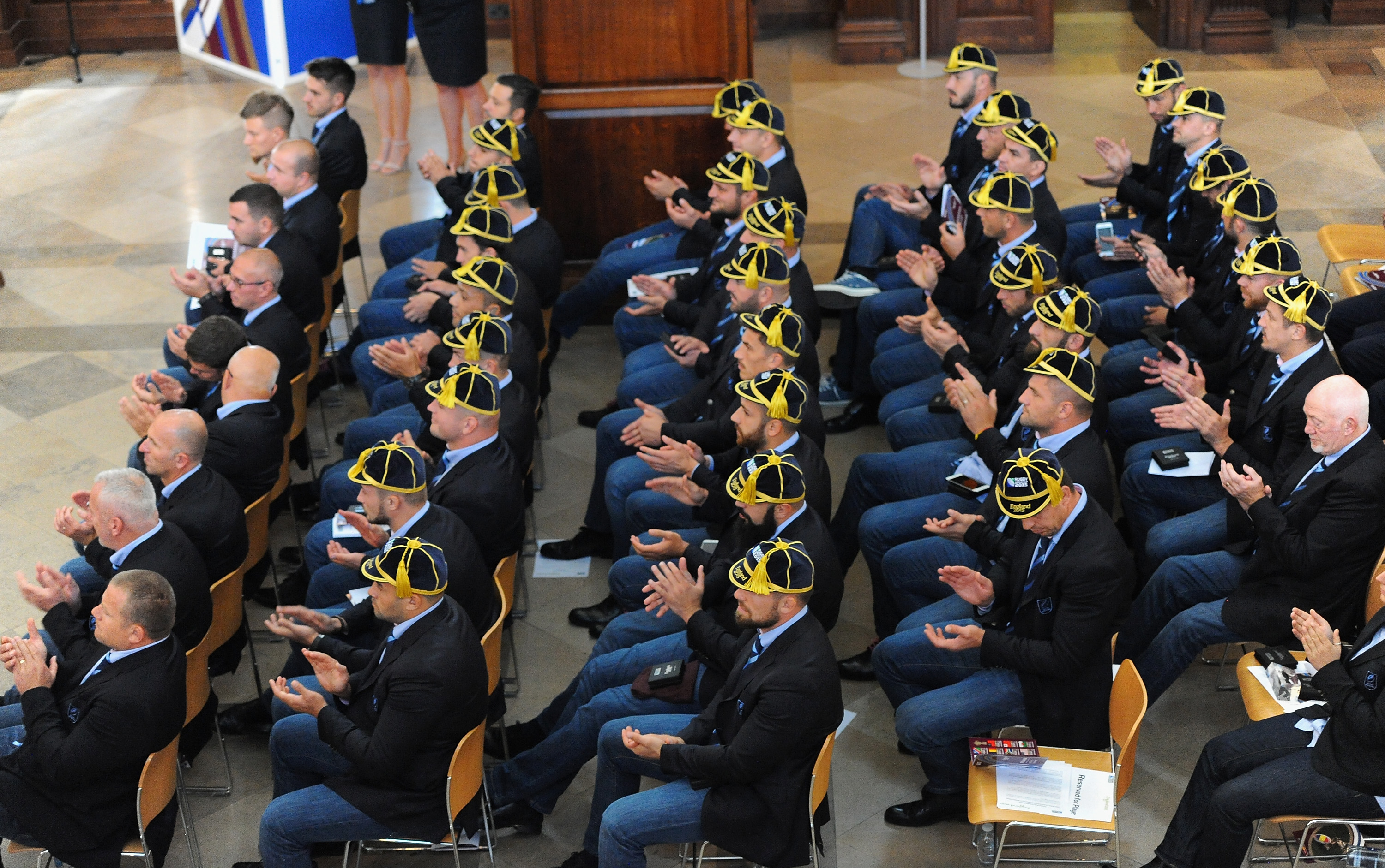 LONDON, ENGLAND – SEPTEMBER 17: The Romanian rugby squad during the RWC 2015 Welcome Ceremony – Romania at Christ Church, Spitalfields on September 17, 2015 in London, England. (Photo by Eamonn M. McCormack/Getty Images for ER2015)