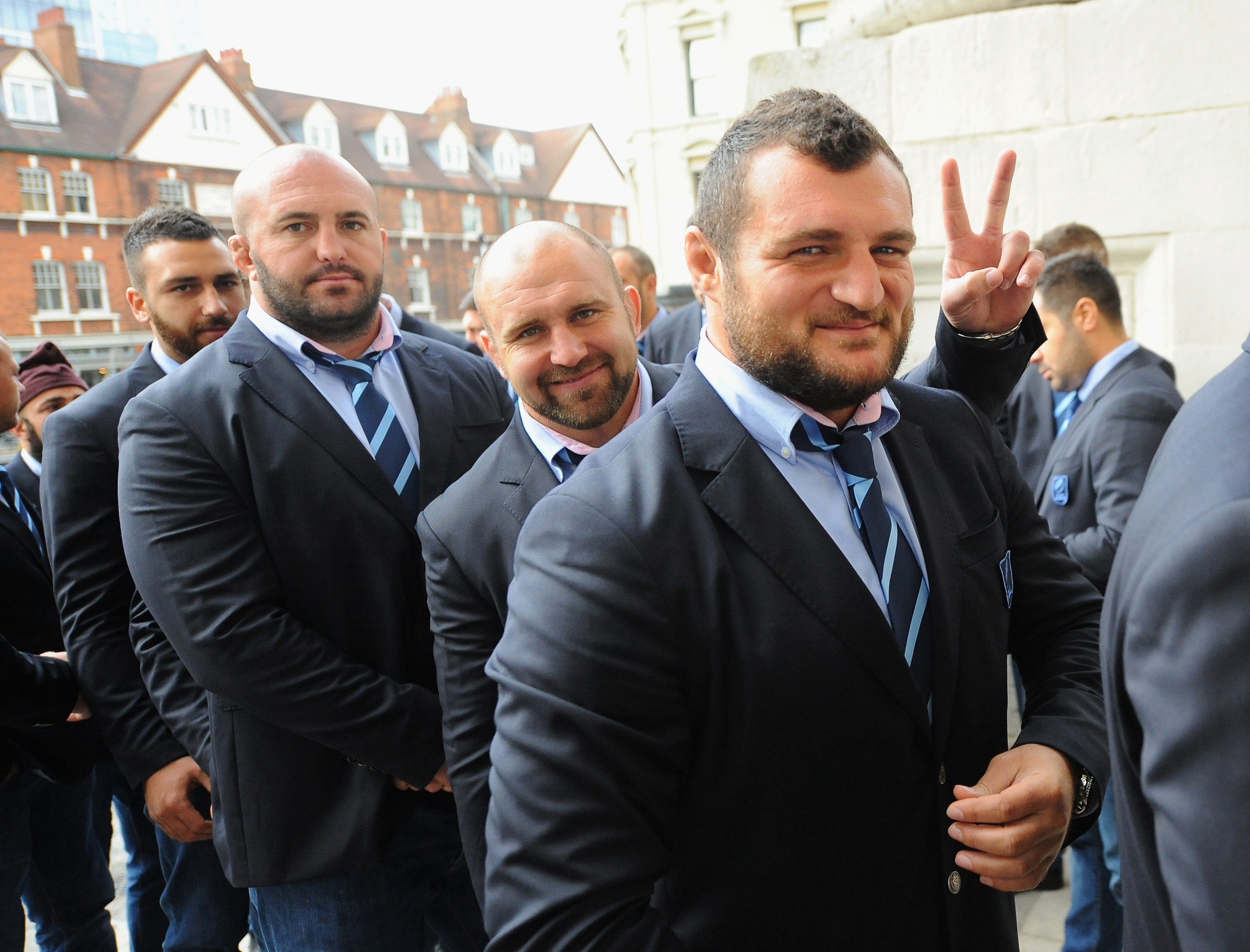 LONDON, ENGLAND – SEPTEMBER 17: Players Horatiu Pungea, Andrei Ursache and Otar Turashvili of the Romanian rugby squad during the RWC 2015 Welcome Ceremony – Romania at Christ Church, Spitalfields on September 17, 2015 in London, England. (Photo by Eamonn M. McCormack/Getty Images for ER2015)