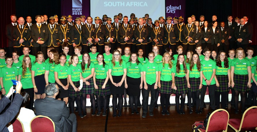 EASTBOURNE, ENGLAND – SEPTEMBER 13: South Africa team pose for a family photo at the South Africa 2015 World Cup team welcoming ceremony at the Winter Gardens on September 13, 2015 in Eastbourne, England. (Photo by Anthony Harvey/Getty Images for ER2015)