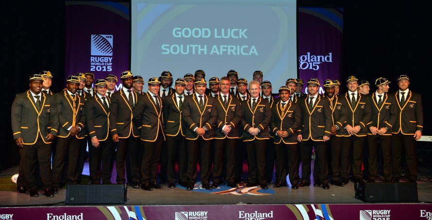 EASTBOURNE, ENGLAND – SEPTEMBER 13: South Africa team pose for a family photo at the South Africa 2015 World Cup team welcoming ceremony at the Winter Gardens on September 13, 2015 in Eastbourne, England. (Photo by Anthony Harvey/Getty Images for ER2015)