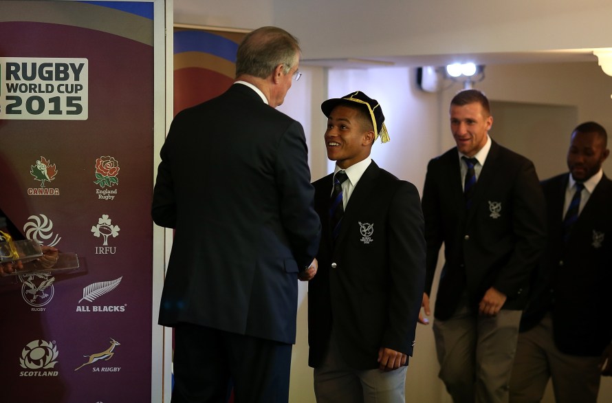 LONDON, ENGLAND – SEPTEMBER 17: Damian Stevens of Namibia recieves his cap from Chairman of World Rugby Bernard Lapasset during the RWC 2015 Welcome Ceremony for Namibia at Hampton Court Palace on September 17, 2015 in London, England. (Photo by Ben Hoskins/Getty Images for ER2015)