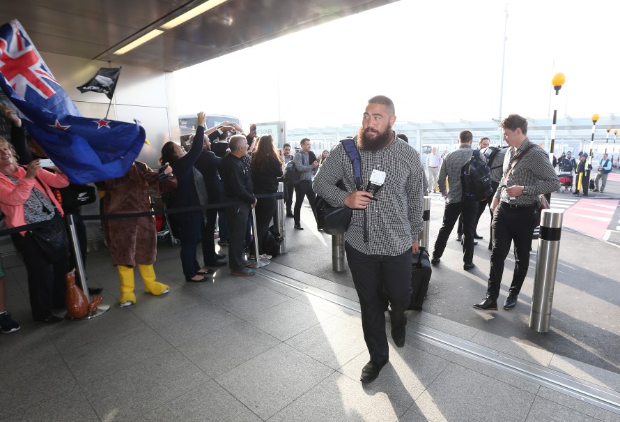 LONDON, ENGLAND – NOVEMBER 02: Charlie Faumuina, of Rugby World Cup winners, the New Zealand All Blacks arrives with team mates at Heathrow Airport at the start of their journey back to New Zealand on November 2, 2015 in London, United Kingdom. (Photo by David Rogers/Getty Images for England 2015)