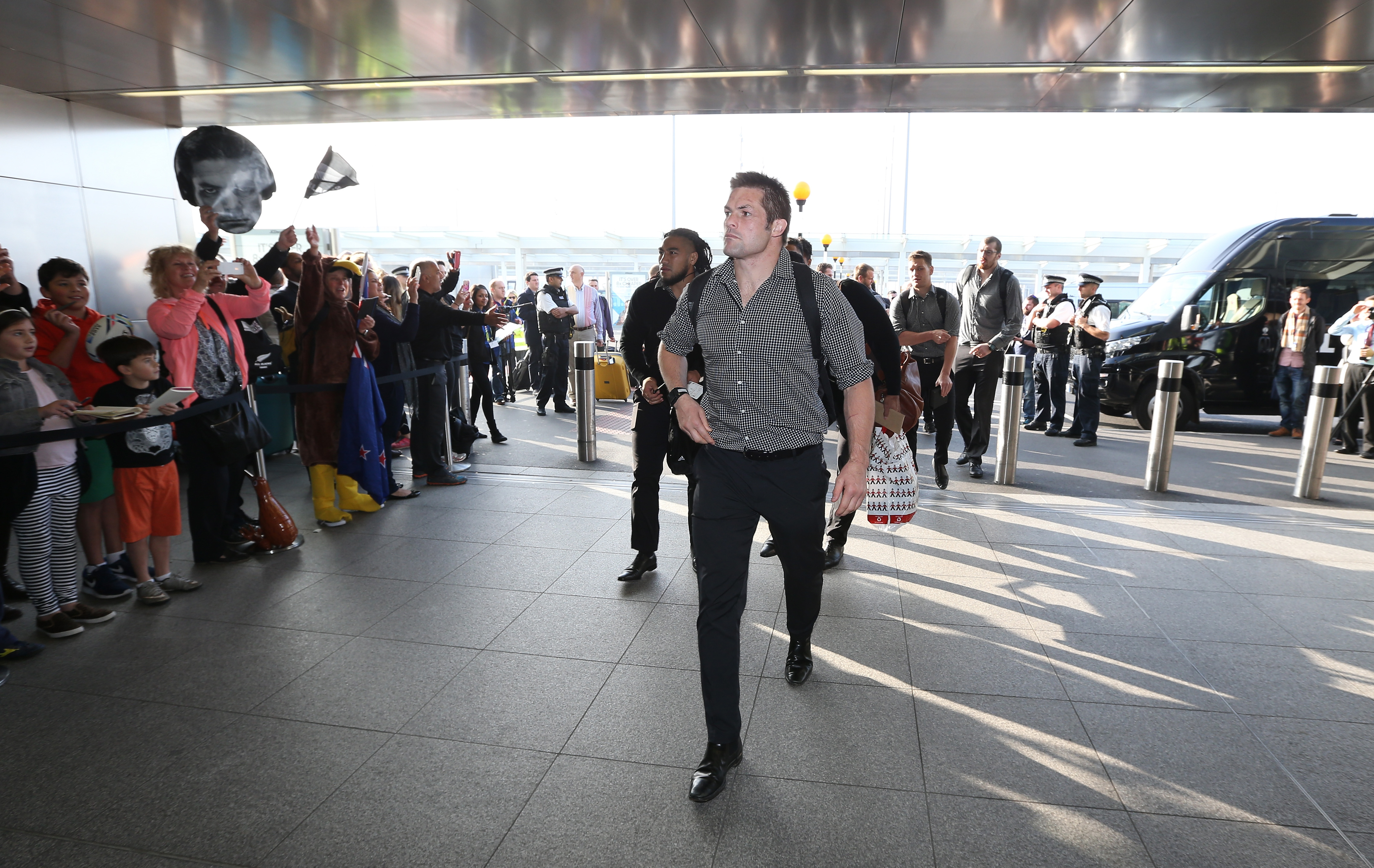 LONDON, ENGLAND – NOVEMBER 02: Richie McCaw, the captain of Rugby World Cup winners, the New Zealand All Blacks, arrives at Heathrow Airport at the start of his journey back to New Zealand on November 2, 2015 in London, United Kingdom. (Photo by David Rogers/Getty Images for England 2015)